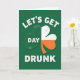 Designed with a deep emerald green background, this St. Patrick’s Day card centers on a three-leaf shamrock that feels like it’s leaning in close, as if inviting friends to gather shoulder to shoulder. The left leaf stays green, while the right side of the clover fills with crisp white and warm orange, echoing the Irish tricolor against the green field ☘️. Across the top, “LET’S GET” curves above the shamrock in worn white lettering, setting up the message like a header. The word “DAY” sits inside the left leaf, tucked neatly into the shape as if it belongs there. “DRUNK” stretches along the bottom in the same weathered white, grounding the layout and balancing the curved text above. A distressed, speckled texture runs through both the letters and the clover, with faded edges and tiny breaks that make the print look aged and well-loved 💚. The shamrock’s white-and-orange section sits on the rightmost leaves, while “DAY” remains framed inside the green left leaf.