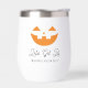 Personalize these spooky wine tumblers to create a perfect Halloween party favour. Design features a smiling orange jack o'lantern face with two lines of custom text beneath; shown with "let's get lit" and your Halloween party name and year.