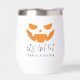 Personalize these spooky wine tumblers to create a perfect Halloween party favour. Design features an orange jack o'lantern face with two lines of custom text beneath; shown with "let's get lit" and your Halloween party name and year.