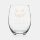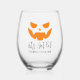 Personalize these spooky stemless glasses to create a perfect Halloween party favour. Design features an orange jack o'lantern face with two lines of custom text beneath; shown with "let's get lit" and your Halloween party name and year.