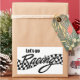 The phrase "Let's Go Racing" with a black and white chequered banner, that looks like it's blowing in the wind, behind it.