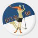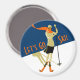 Graphic fridge magnet design for skiers, using bold shapes and bright strong colours. This design has been adapted from an old vintage 1920's travel poster showing a stylish woman skier with a bright orange flowing scarf blowing in the breeze against a bright blue sky. She's on long wooden skis, with free heel bindings; and carries a single ski pole. The words say: Let's Go Ski! in bright orange in a vintage style font. A great gift for your skiing friends, or for your refrigerator!
