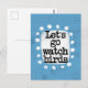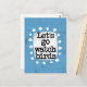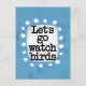 A cute birdwatching typographic design that says "Let's Go Watch Birds". It's black text on a white rectangle with funky, playful dots surrounding it, all on a light blue background.