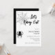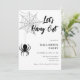 This modern chic black and white invitation features "let's hang out" written in script and a spider hanging from its web.