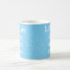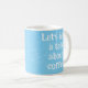 Light blue mug with white splatter texture says "Let's have a talk about coffee".