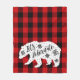This fun winter fleece blanket features red buffalo check plaid, a white bear, snowflakes, and stylish typography reading, "Let's Hibernate."