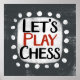 "Let's Play Chess" is a cute text design in grey with black and red text, along with a white accent shape and white textured whimsical dots surrounding it.