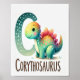 This 8.5x11 poster for the letter “C” adds a splash of charm with a cheerful Corythosaurus by its side. The letter “C” curves gracefully in a teal shade with playful white spots, creating a dynamic frame for the scene. The Corythosaurus stands with a sweet smile, showing off a rainbow of colours from yellow and orange to teal and pink. Its polka-dotted body and colourful back plates make it stand out as a fun and friendly dino. The word “CORYTHOSAURUS” is printed clearly below in bold brown letters, making it easy for kids to connect the letter with the dinosaur. This poster continues the delightful dinosaur alphabet series, bringing learning and colour together in a way that captures young imaginations.