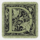Charming decorative letter D initial monogram calligraphy style typography first letter in black over vintage sage green - avocado green book lining with off white Ginkgo biloba leaves.