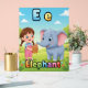 Cute and colorful alphabet poster featuring the letter E with a sweet girl character playfully eating an elephant-shaped treat.