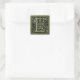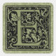 Charming decorative letter E initial monogram calligraphy style typography first letter in black over vintage sage green - avocado green book lining with off white Ginkgo biloba leaves.