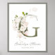 Elegant Letter G monogram nursery poster featuring a watercolor illustration of pinkish and white flowers accented with greenery foliage.
