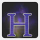 Stickers met de letter H. (bijvoorbeeld je initiaal) Leuk als je naam met de H begint of die van een ander. Achter de letter is een raster en mysterieuze wolken met een licht die erop schijnt. De letter H is gevuld met een plaid patroon en een grijze rand erom heen. kleuren blauw, paars, geel en zwart.