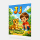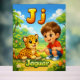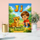Cute and colorful alphabet poster featuring the letter J with a friendly jaguar and a happy child illustration.