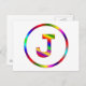 A colourful monogram with the letter J in rainbow colours inside of a rainbow circle. Share your pride of your name with a fun happy initial J.
