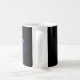 Mok met de letter N. (bijvoorbeeld je initiaal) Leuk als je naam met de N begint of die van een ander. Achter de letter is een raster en mysterieuze wolken met een licht die erop schijnt. De letter N is gevuld met een plaid patroon en een grijze rand erom heen. kleuren blauw, paars, geel en zwart.