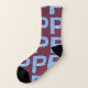 These socks feature a collection of the letter "P" with a bold print font and dual split colour theme each sock is light blue on one side and maroon on the other. The light blue side has light blue letters maroon outline the maroon side has light blue letters maroon outline with a white web design inside of the letters in this mix match all over print style, all socks are made using unisex sizing.