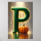 This radiant letter “P” print celebrates the heart of autumn with golden light, sparkling charm, and a perfect pumpkin companion. A rich green glitter-textured capital P stands tall beneath a warm spotlight, its deep shimmer surrounded by glowing stardust. Nestled beside it sits a plump orange pumpkin, its smooth curves and curling stem bathed in the same magical glow.