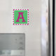La lettre majuscule "A" est faite dans une couleur fuchsia sur un arrière - plan vert vif. La bordure prend sur la couleur fuchsia de la lettre et a un design en forme de losange tout autour du bord en fuchsia et blanc.