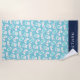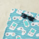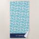 Cute personalized beach towel for your little gamer features a pattern of retro game controllers and handheld video game consoles on a turquoise background, with a name or initial along the bottom.