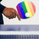 LGBT flag digital art rainbow colours red orange yellow green blue purple with modern geometry design.