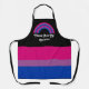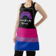 Medium-sized apron with an image of a bisexuality pride flag and a rainbow; pink, purple, and blue design on a black background, with a customizable text template for your own name or message