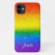 Carry your cell phone and protect it in style with this custom glitter and glam LGBT phone case and show your support. The chic rainbow striped design includes shades of red, orange, yellow, green, blue and purple faux glitter with a name in white script to personalize. Show your pride!