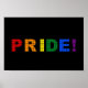 Design with text “Pride!” in colours of LGBT (lesbian, gay, bisexual, and transgender) rainbow stripes pride flag, rainbow love gay pride design on black background