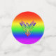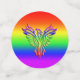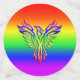 Gorgeous LGBT confetti. They feature an embossed-look, rainbow phoenix, wings outstretched and rising from the ashes on a matching rainbow background.