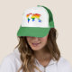 Green Trucker hat with LGBT (lesbian, gay, bisexual, and transgender people) rainbow stipes map of world, rainbow pride design, by pinkbrickroad