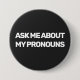 LGBTQ gender fluid pride button featuring the customizable wording "Ask me about my pronouns" in white all caps lettering, on a black background.