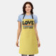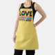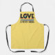 LGBTQ Pride bright yellow apron featuring the caption Love is Never Wrong in black lettering decorated with a little rainbow heart and rainbow flag.