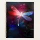 Lumineuse, volante, libellule rouge, avec des ailes transparentes et détaillées sur arrière - plan sombre, nocturne, lumineux avec plantes tropicaux et lucioles. libellule rouge.