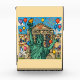 A powerful satirical design : The Statue of Liberty celebrates joyfully in front of the grand Ministry of Peace, surrounded by balloons, fireworks, and festive decorations.