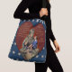 This ever useful cross-body tote features the beautiful and powerful imagery of a young lad seated on the lap of the Statue of Liberty, set within a heart shaped frame on a bed of white stars on navy. Captions on front is a quote about liberty from Judge Learned Hand; on back are 4 custom text fields where you can declare your support for the 2020 Presidential Election candidate of your choice - or personalize with your name, or any other message. Image derived from a late 19th Century illustration & enhanced by Leslie Sigal Javorek.