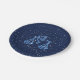 Paper plate featuring the symbol for Libra in soft silver blue, overlaid with the stars of the constellation, against a starry sky background in deep midnight blue