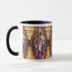 This colourful mug features a repeating pattern of aisles of book shelves in the stacks of a huge library. The bright lighting reveals book spines in a kaleidoscope of colours: red, green, blue, black, white, gold, brown, purple. The symmetrical angle creates abstract geometric patterns that seem to lead to infinity. The reflections on the freshly waxed floor contribute to the overall pattern.