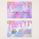 Cette carte de présentation de logo pour les affaires de boucles d'oreilles basses suspendues girly et glamour est le moyen idéal pour styliser votre emballage et ajouter votre propre touche personnelle et personnalité. Elle présente de faux éclaboussures de paillettes épaisses de couleur arc-en-ciel de licorne scintillante imprimée sur un fond iridescent holographique. La typographie est un élégant script cursif avec une police serif moderne pour correspondre. La palette de couleurs comprend le rose, le pêche, le bleu, le violet, le jaune et le corail. C'est chic, joli, unique et luxueux; le moyen parfait pour annoncer votre entreprise et styliser votre matériel de marketing et de publicité pour vos clients. (les trous de boucles d'oreilles sont uniquement des marqueurs imprimés, la perforation doit être effectuée par le client)