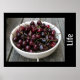 Photograph of cherries on black background with the word "Life" printed down right side.