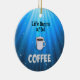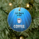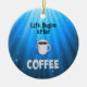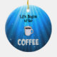 Life Begins after Coffee, blue starburst design, Christmas ornament.