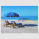 Life begins at Retirement. Colourful design on a white sandy beach with beach umbrella and chairs. The good life!