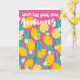 This brightly coloured friendship greeting card features colourful yellow and teal lemons on a cheery magenta background with handwritten font reading "When life gives me lemons". The inside of the card finishes the message in a twist on the popular saying and says "You get me out of my sour mood" in a matching sunny yellow font and a cute lemon slice accent. This card makes a great "just because" card to send to friends!