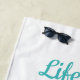 A brightly coloured beach towel with the words Life is a Beach! and a design with the word Summer amidst tropical flowers and beach waves.