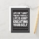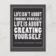 Life isn't about finding yourself. Life is about creating yourself. A reminder that we make our own destiny and become who want ourselves to be. Black and white design, with bold typography in charcoal tones of grey and white.