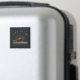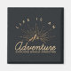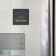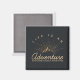 A magnet with a gold coloured illustration on a black-grey background. Designed with an illustration of a mountain with the suns rays shining outward from behind. Typography says: Life is an Adventure explore dream discover.