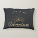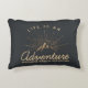 Accent pillow with a gold coloured illustration on a black-grey background. Designed with an illustration of a mountain with the suns rays shining outward from behind. Typography says: Life is an Adventure explore dream discover.