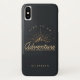 A personalized casemate phone case with a gold coloured illustration on a black-grey background. Designed with an illustration of a mountain with the suns rays shining outward from behind. Typography says: Life is an Adventure explore dream discover.
