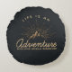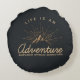 Round pillow with a gold coloured illustration on a black-grey background. Designed with an illustration of a mountain with the suns rays shining outward from behind. Typography says: Life is an Adventure explore dream discover.