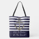 This weekender tote bag is perfect for a weekend on the beach or for the jet-setter who loves to travel to new tropical locations and relax on the beach. The design features nautical blue and white stripes with a vibrant anchor. The text "Life is Better At the Beach" is written in script on the bottom of the bag.