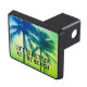 Life is better at the beach palm tree photo car trailer hitch cover. Tropical sunset design with custom text for name, location or quote. Upload your own picture optionally.